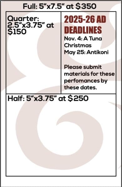One way to support us is to purchase ad space in a Bag&Baggage playbill! Advertising in our programs is a great way to associate your company, brand, or product with local theatre and our growing artistic community. And, our audiences are extremely loyal; they love us and what we do, and they are extremely motivated to support businesses that support Bag&Baggage.
